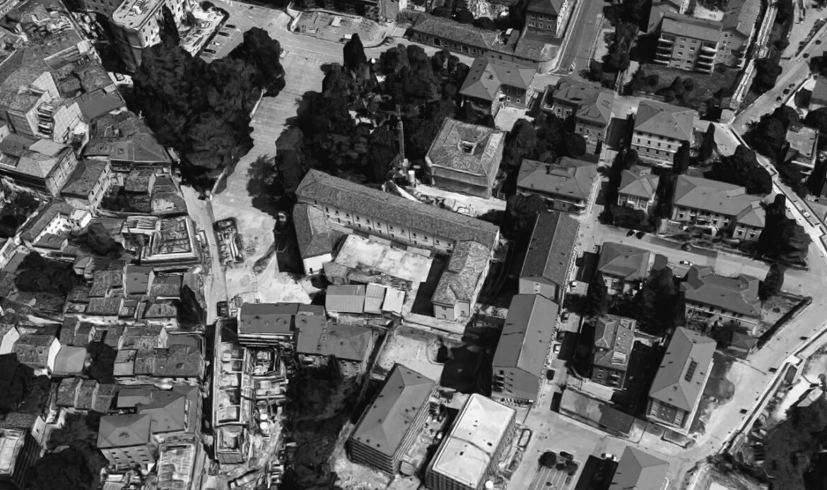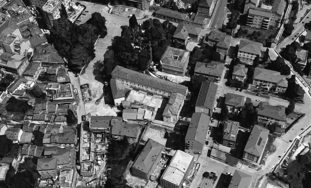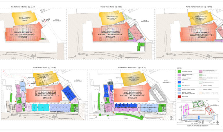 La riqualificazione e l’adeguamento funzionale e tecnologico delle strutture  del complesso edilizio in oggetto, finalizzati alle specifiche esigenze della Pubblica Amministrazione, fa parte del programma di riorganizzazione degli uffici comunali previsto dal Comune di L’Aquila. Il complesso edilizio in questione è costituito da quattro corpi di fabbrica  dislocati intorno ad una corte ove insiste la struttura dell’autorimessa interrata. E’ ubicato all’interno della cinta muraria, in prossimità della stessa, nel settore est della città antica (Quarto S. Maria), nelle immediate vicinanze della basilica di S. Bernardino, sorgendo ai piedi dell’omonima scalinata. L’area di intervento si estende su una superficie urbana di circa 3.600 mq, dei quali attualmente circa 1.435 occupati da edifici, circa 930 dal cortile superiore (di cui circa 770 occupati dalla rimessa interrata) e circa 1450 di sistemazione delle aree al contorno.