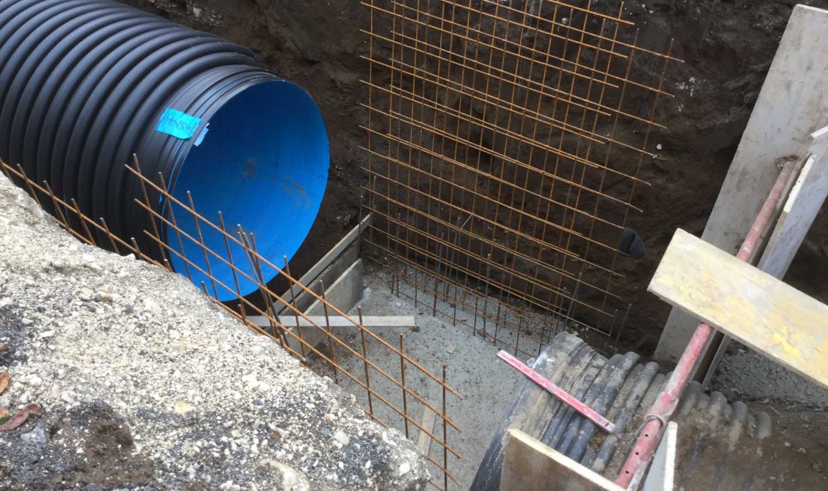 posa in opera della tubazione in p.v.c. di diametro Ø 300 mm tra i pozzetti e le caditoie, interamente inglobate nel conglomerato cementizio;