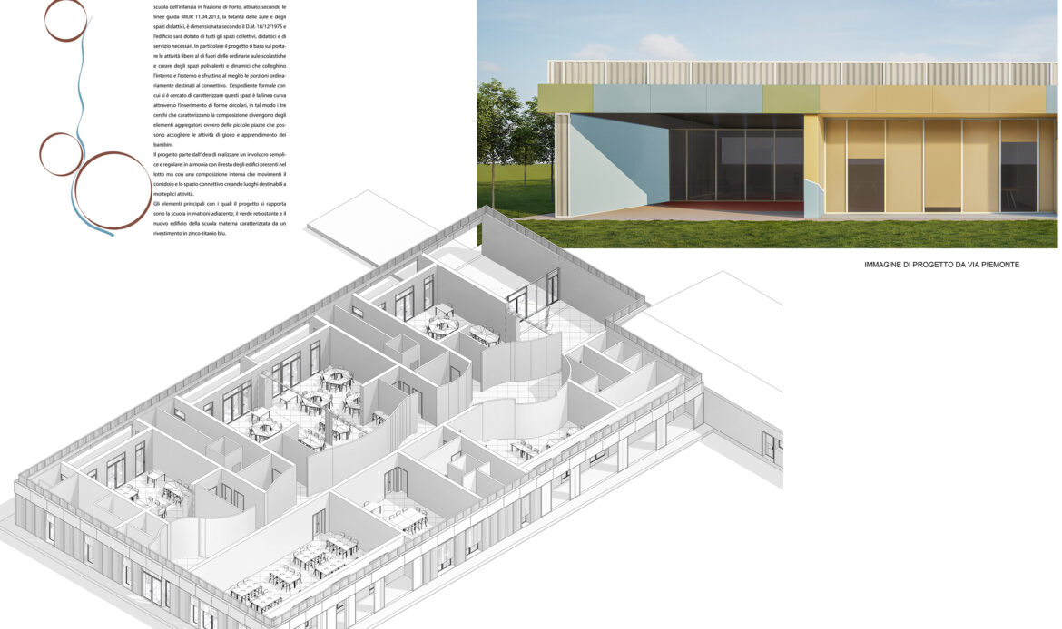 L’edificio sarà dotato di tutti gli spazi collettivi, didattici e di servizio necessari; in particolare il progetto si basa sulla volontà di portare le attività libere al di fuori delle ordinarie aule scolastiche, al fine di creare spazi polivalenti e dinamici, che colleghino l’interno e l’esterno e sfruttino al meglio le porzioni ordinariamente destinate al connettivo. L’espediente formale con cui si è cercato di caratterizzare questi spazi è la linea curva, attraverso l’inserimento di forme circolari: i tre cerchi che caratterizzano la composizione divengono degli elementi di aggregazione, ovvero delle piccole piazze che possono accogliere le attività di gioco e apprendimento dei bambini.